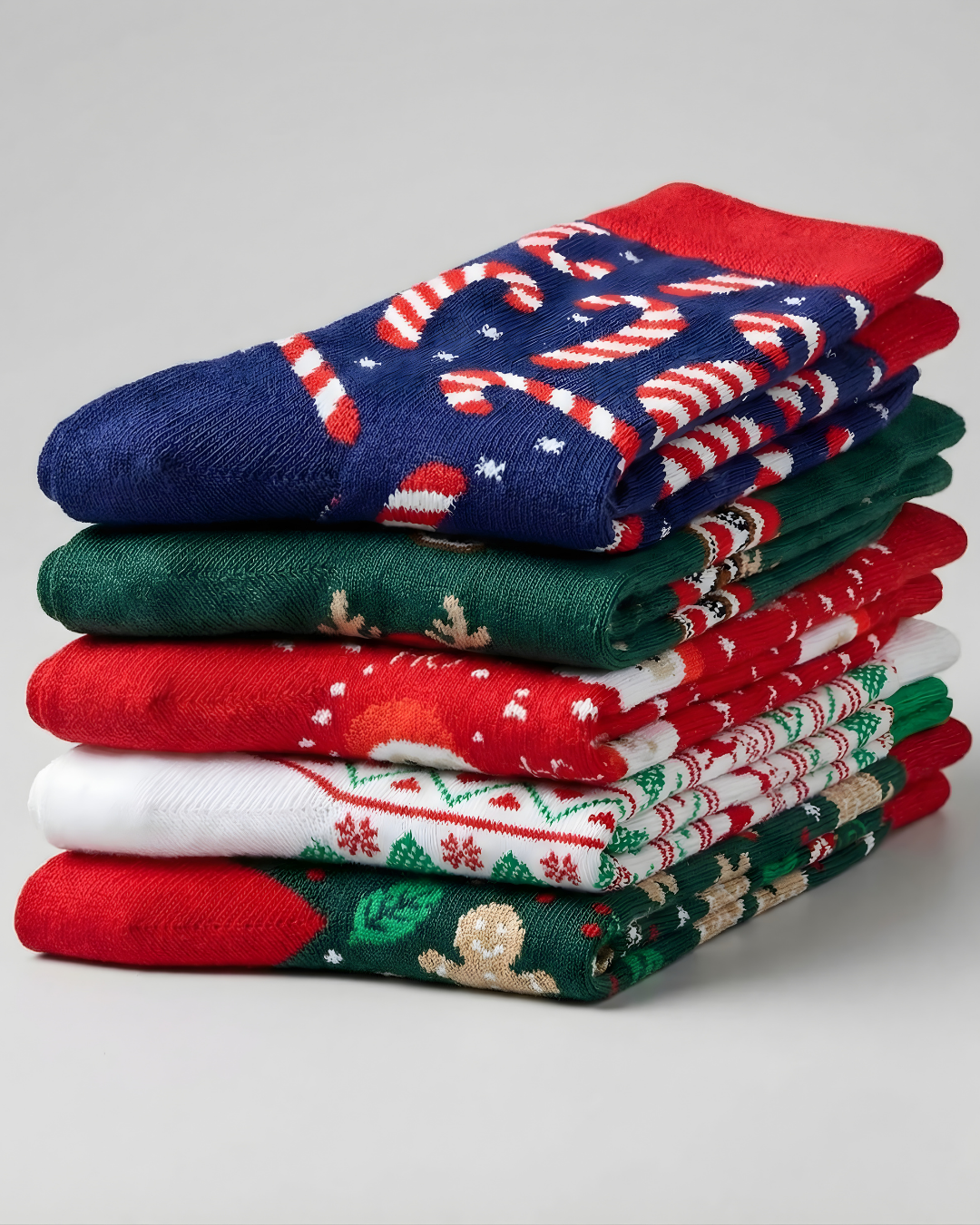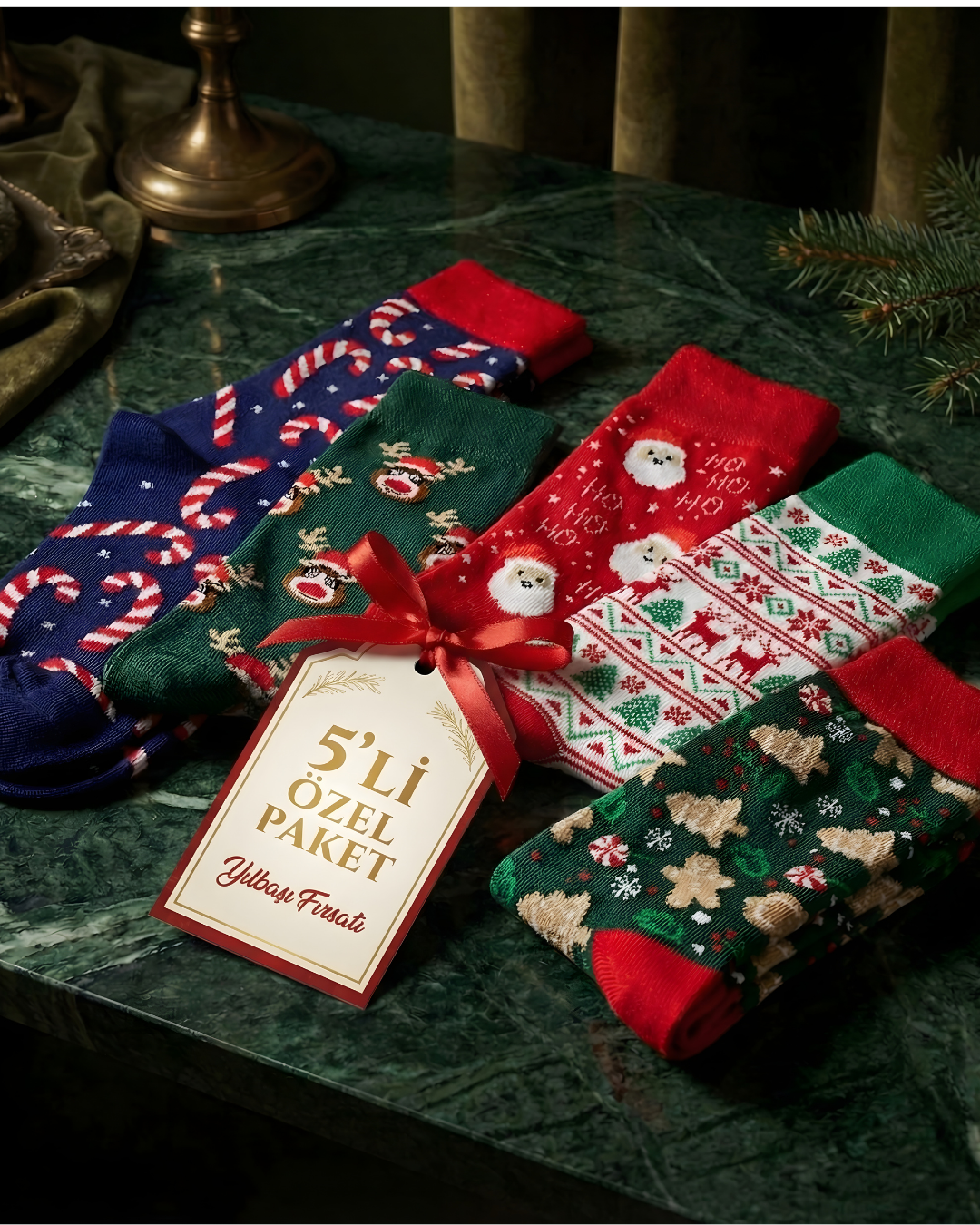 Yeni yıl ruhunu tarzına yansıtmak isteyenler için tasarlanan Yılbaşı Konseptli 5’li Çorap Seti, rengarenk ve eğlenceli desenleriyle kış kombinlerine enerji katıyor! Yumuşak dokusu sayesinde gün boyu konfor sağlarken, esnek yapısı farklı ayak numaralarına kolayca uyum sağlar.